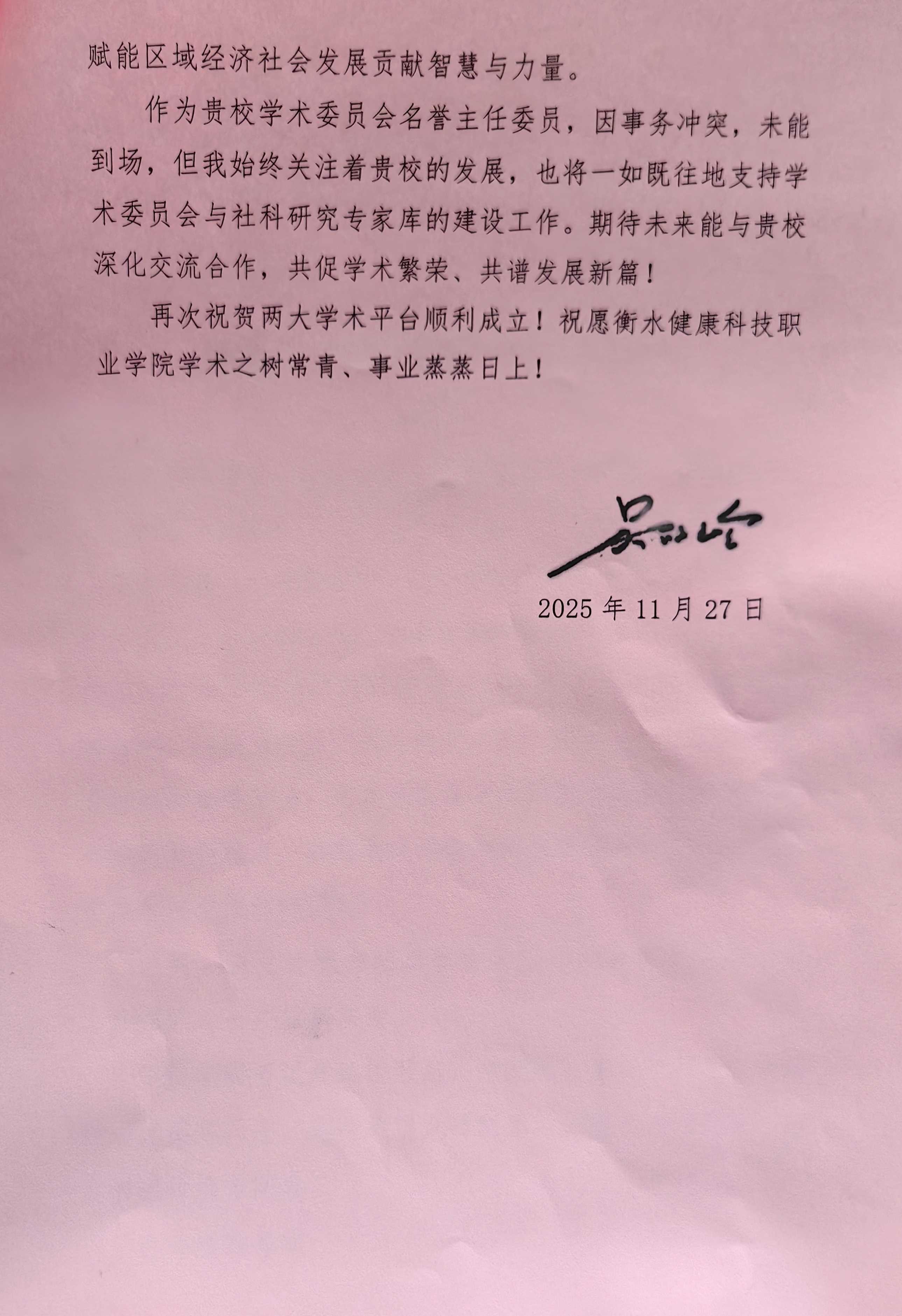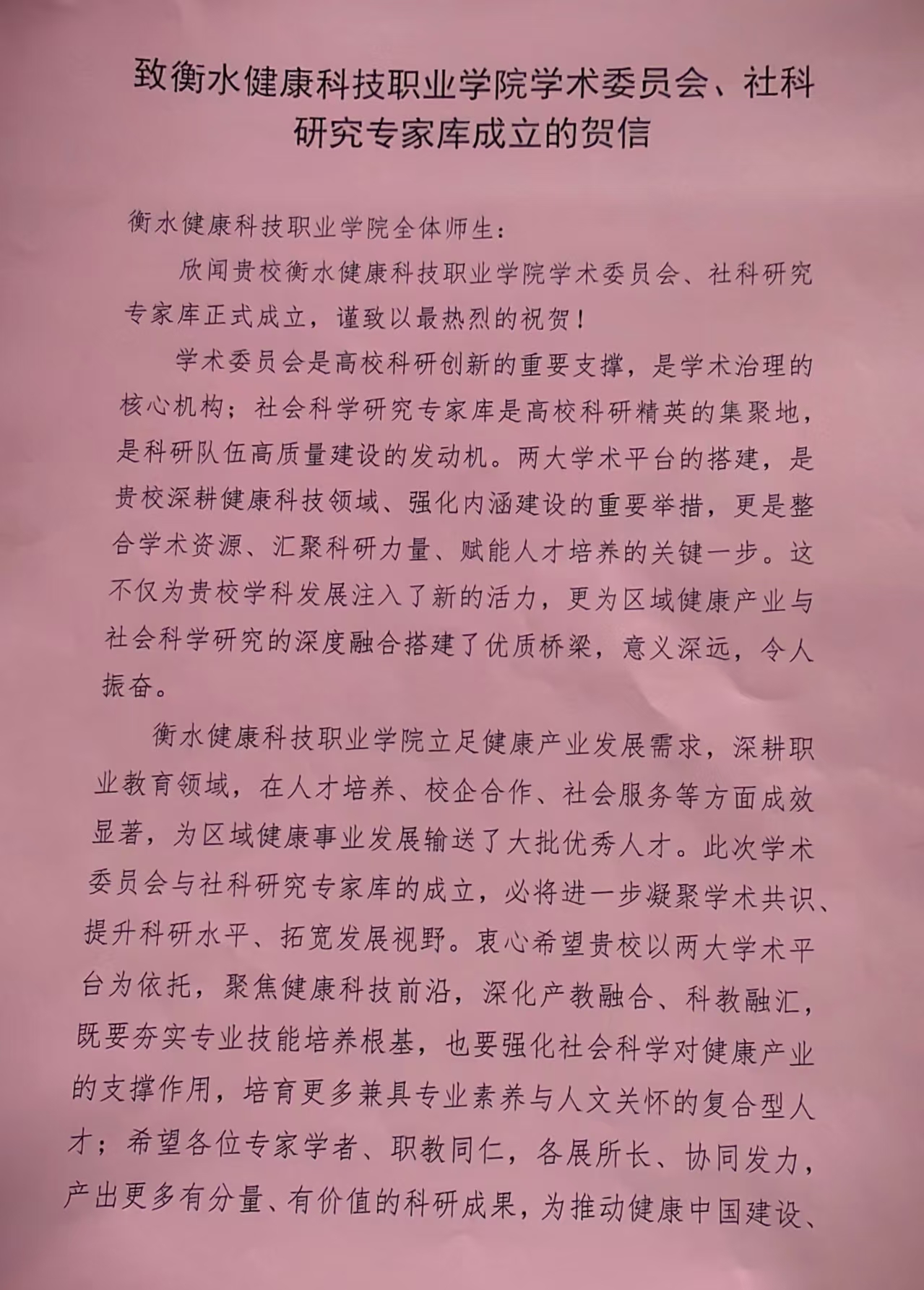 “职业教育是技能人才培养的主阵地,学术科研则是职业教育高质量发展的核心引擎。”中国工程院院士吴以岭在贺信中指出,“衡水健康科技职业学院立足健康产业发展需求,深耕职业教育领域,在人才培养、校企合作、社会服务等方面成效显著,为区域健康事业发展输送了大批优秀人才。此次学术委员会与社科研究专家库的成立,必将进一步凝聚学术共识、提升科研水平、拓宽发展视野。”