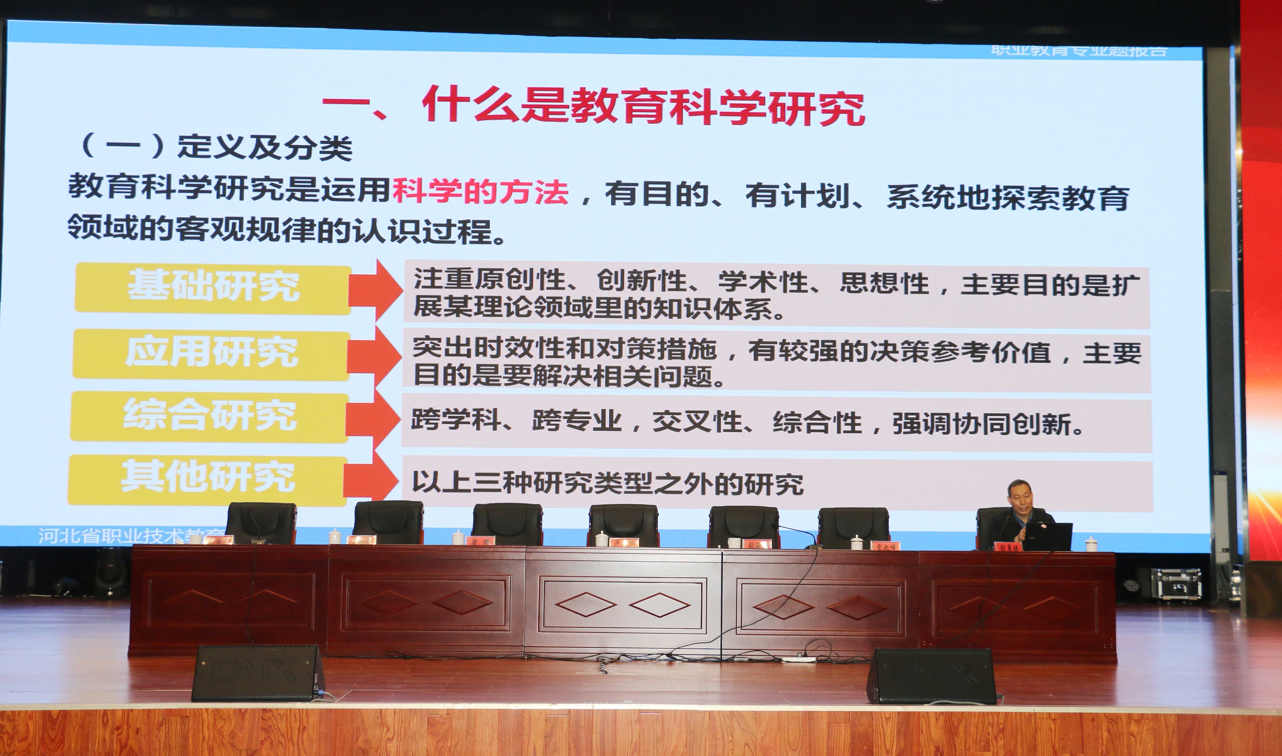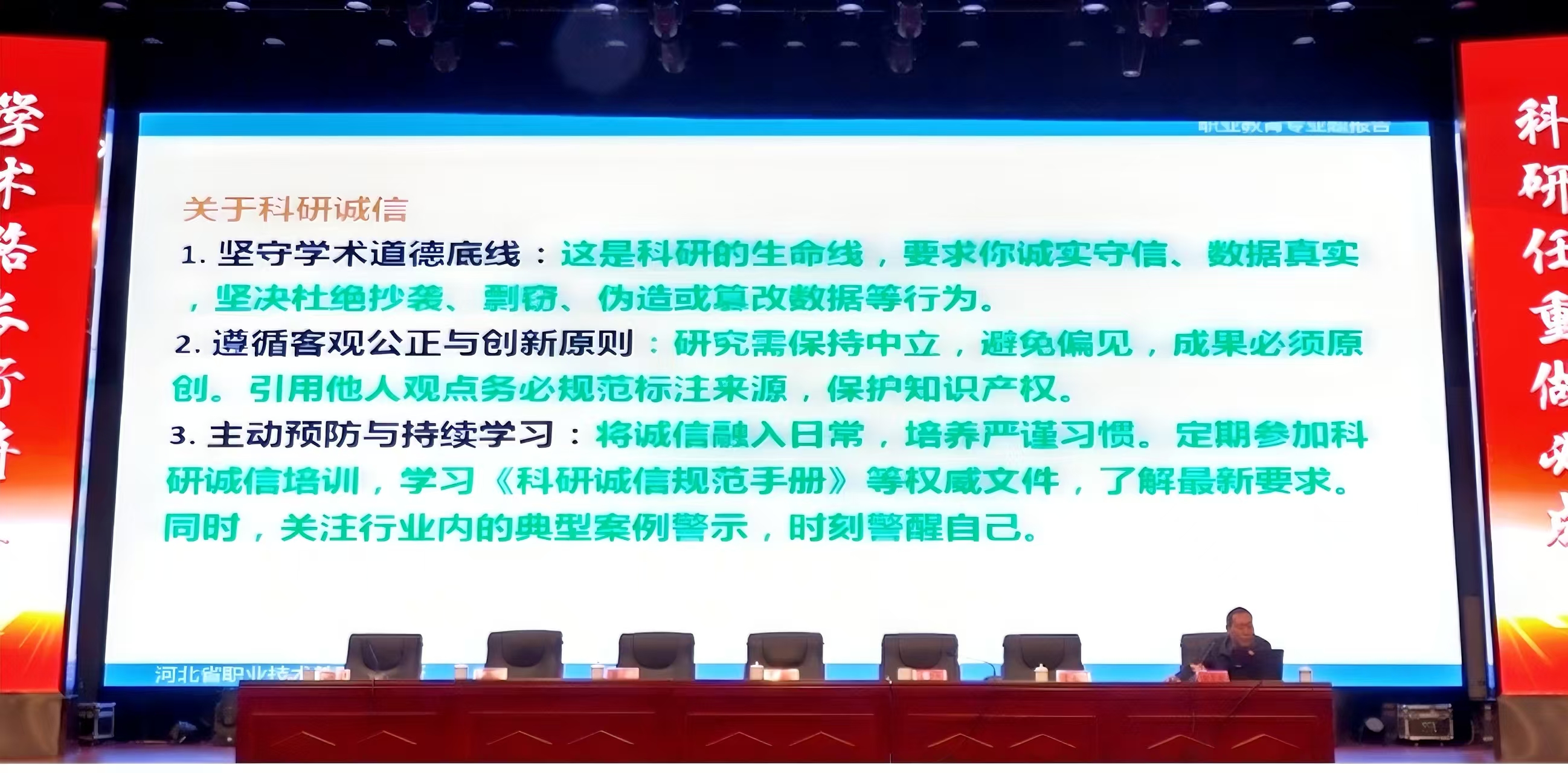 河北师范大学博士生导师、河北省职业技术教育研究所副所长、教育部职业教育发展中心基本科研业务费管理咨询委员会委员谢勇旗教授作“高职院校高水平课题申报与实施及科研诚信建设”的专题报告。谢教授全面阐述课题申报的全流程实施细则,从申报立项、方案设计、过程管理到结题验收等各环节均作出清晰规范,为科研工作者开展课题研究提供了明确的行动指引。同时,进一步明确了科研诚信的底线要求,着重强调在数据采集、成果撰写、学术引用等关键环节必须恪守客观真实、严谨求实的原则,坚决杜绝抄袭剽窃、数据造假、不当署名等学术不端行为,切实维护风清气正的科研生态。