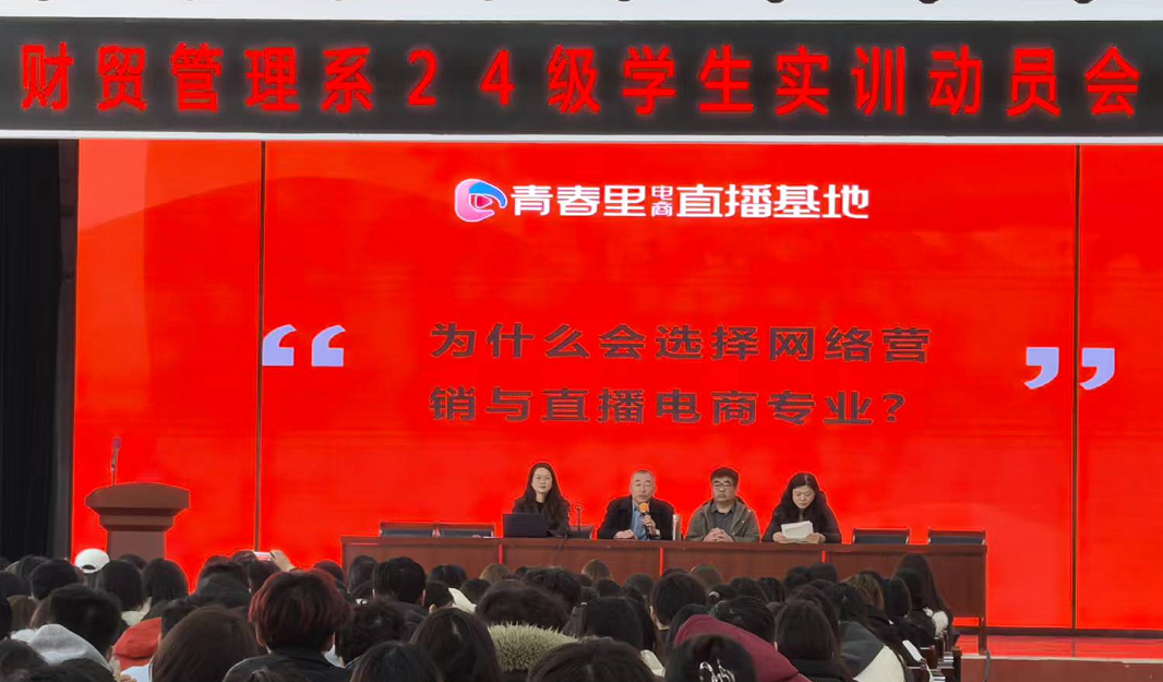 产教融合深耕耘,青春逐梦正当时。为深化产教融合、强化实践育人,切实帮助24级学生明晰实训方向、夯实就业根基,3月9日我院财贸管理系于学校礼堂隆重举行24级学生实训动员会。青春里直播基地负责人、23级优秀实习学生代表应邀出席,系部领导、专业教师、辅导员及24级全体学生共同参会。